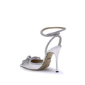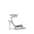 Silk Pumps with double jewel bow by Mach&Mach, an iconic model that combines elegance and brightness in a sophisticated design. Made of fine silk, these pumps stand out for the double front bow embellished with brilliant jewels. The tapered toe gives a boost to the figure, while the ankle strap with adjustable buckle, decorated with jewel details, guarantees a perfect fit. The stiletto heel completes the silhouette, together with the logoed insole for an extra touch of refinement.