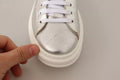 Silver Full Grain Leather Lace Up Sneakers Shoes