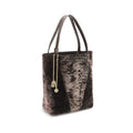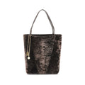 The Spin Shearling Tote Bag by Chloé is a dark brown shearling tote accented with gold-tone hardware. It features double handles and a decorative chain with Chloé and Horse pendants. The tone-on-tone interior completes the refined design. It can be worn over the shoulder or carried by hand by slipping the handles inside the ring for convenience.