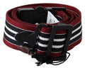 is crafted from leather fabric, this stylish belt featuring stripe black and red design and a buckle fastening.