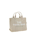Cotton The Medium Tote Handbag by Marc Jacobs, two rigid tubular top handles, top zipper closure, single interior pocket, adjustable and removable flat shoulder strap, contrasting iconic brand monogram print on front, contrasting iconic brand monogram patch applied on back.