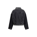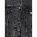 The Trucker jacket features a loose, slightly oversized fit with a workwear-inspired style. Made from rigid Black Cotton Denim with a stone-wash finish, it includes contrast patches and small faceted studs for added detail. The design features a shirt collar, flap front pockets with buttons, adjustable closures at the hem and cuffs, and a front button fastening. Pair it with matching denim for a standout coordinated look.