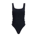 The Tiffany One-Piece Swimsuit by Hunza G combines elegance and comfort in a sporty design with a strong character. Featuring tone-on-tone straps and crossed cut-out details on the side panels, it is enriched by contrasting bows that add a sophisticated and dynamic touch. Made in the exclusive Original Crinkle fabric, it adapts perfectly to every body shape thanks to its ability to stretch, sculpt and support the shapes, ensuring a unique and versatile fit.