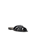 Calfskin Tribute Sandals by Saint Laurent, square toe, flat sole, woven on front, logoed insole.