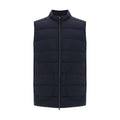 Vest by Herno, high collar, front panel zipper closure, two front zippered welt pockets, quilted design, monochrome pattern, adjustable waistband via concealed drawstring, regular fit.