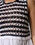 top blends modern minimalism with refined craftsmanship. Featuring a chic white and black knitted design, it offers a soft texture and a flattering sleeveless silhouette. Finished with a classic round neckline, it’s perfect for creating effortlessly stylish and contemporary looks.