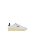 Calfskin Leather Sneakers by Autry, round and perforated toe, frontal lace up closure, tonal label seamed on a leather tongue, iconic back patch in contrast with embossed logo, branded sole in rubber, iconic lateral U.S. flag detail with logo.