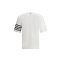 The Striped T-Shirt by Thom Browne features a classic and elegant design with a distinctive striped detail. Complemented by a logo plaque, a ribbed crew neck and a straight hem, this T-shirt combines simplicity and sophistication, making it a versatile garment for any occasion.