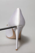pumps are crafted from smooth white satin with a classic peep-toe design. Adorned with sparkling crystal embellishments, they exude refined luxury and timeless Dolce & Gabbana sophistication.
