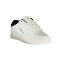 Elevate your sneaker game with Calvin Klein’s striking sports shoe, seamlessly fusing function with high fashion. The crisp white silhouette, adorned with contrasting blue accents, embodies modern design while ensuring comfort through its removable footbed. These sneakers aren’t just a style statement; they’re a nod to sustainability with a 50% recycled thermoplastic rubber sole, keeping you eco-consciously on-trend. Walk with purpose and an air of sophistication wherever you go.