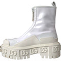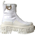 Gorgeous brand new with tags, 100% Authentic Dolce & Gabbana white leather and rubber ankle boots featuring gold-tone logo plaque, front zip fastening, pull-tab at the heel and chunky rubber lug sole.