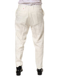 men’s trousers are tailored from lightweight white linen, offering a crisp and breathable fit. Perfect for formal occasions or sophisticated summer looks, they combine classic tailoring with the brand’s signature luxury style.
