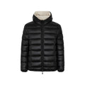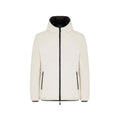Suns reversible polyester padded jacket with rainproof zip closure and covered snap buttons, fixed hood, two side pockets, and inside pockets.