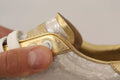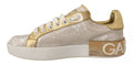 Gorgeous preowned with tags, 100% Authentic Dolce & Gabbana gold-tone and white Portofino sneakers are decorated with a mother-of-pearl print which makes them even more luxurious.