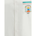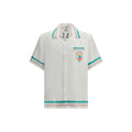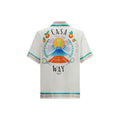 Casablanca’s short-sleeved silk The Casa Way Shirt is a printed design featuring the house’s iconic graphics inspired by nature, architecture and tennis. Made of fine silk twill, it is completed with a Cuban collar, concealed front button closure, CC woven logo corozo buttons, and striped piping on the collar, cuffs, and hem.